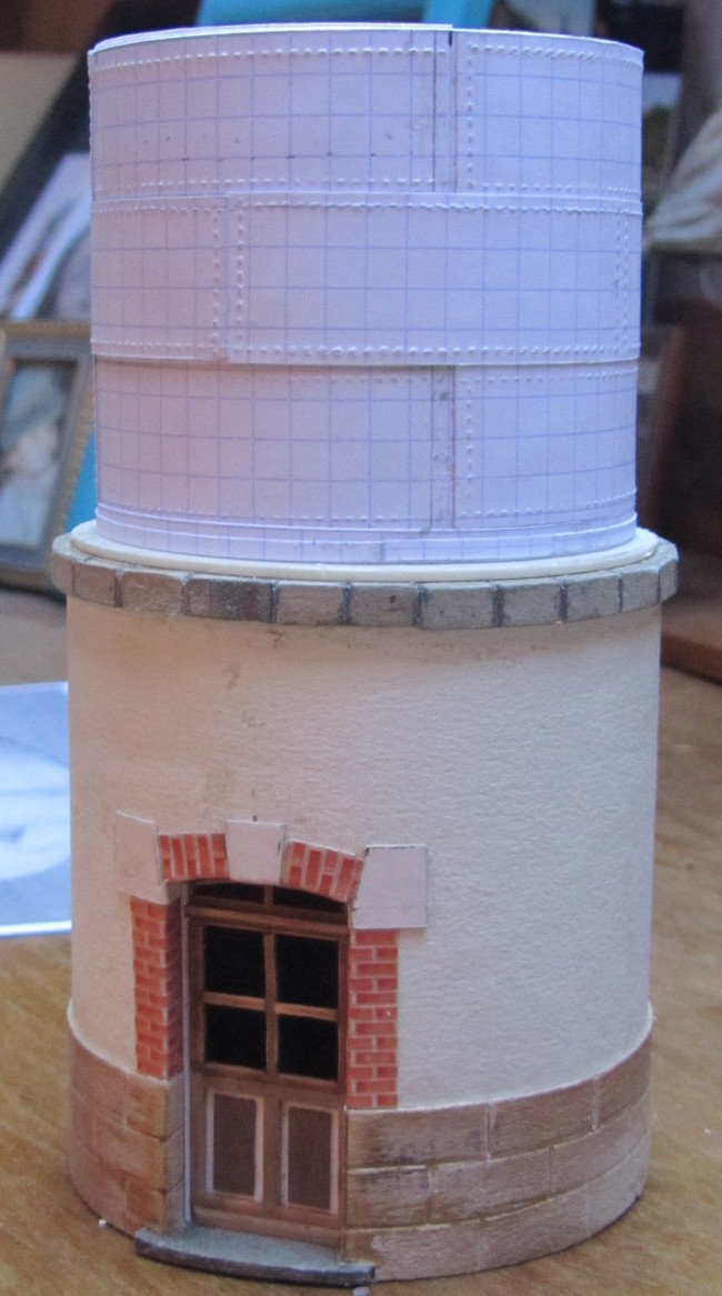 Le dessus de la cuve est en plastique pour des raison de solidité, il est découpé dans un couvercle de pot de...crème fraîche de...Normandie! (pas très diététique le modélisme!). Le trop plein et l'évent sont en place. la base de la cuve est un quart de rond usiné dans un bout de tube PVC (descente de gouttière). sur certain château d'eau, la base boulonnée de la cuve est protégé par un habillage ( en zinc?) et c'est cette option que j'ai choisi.