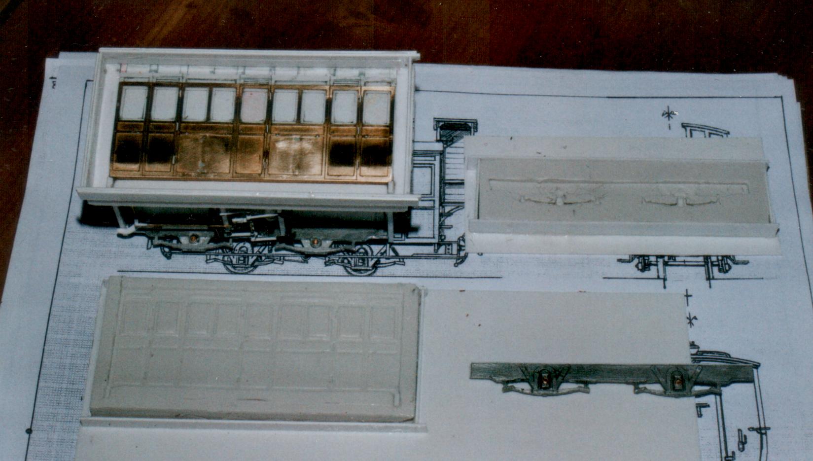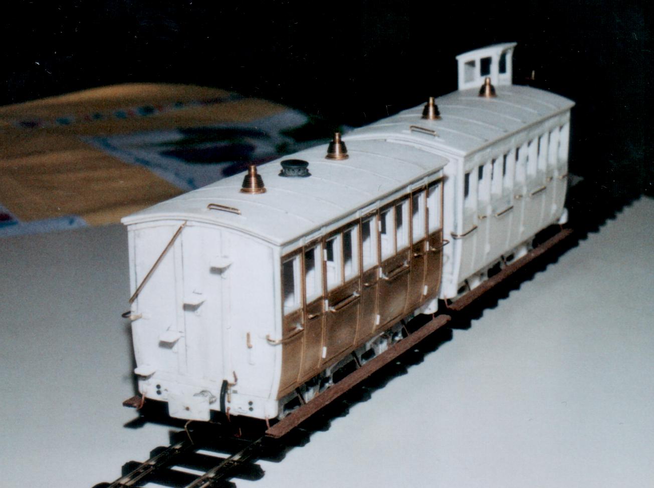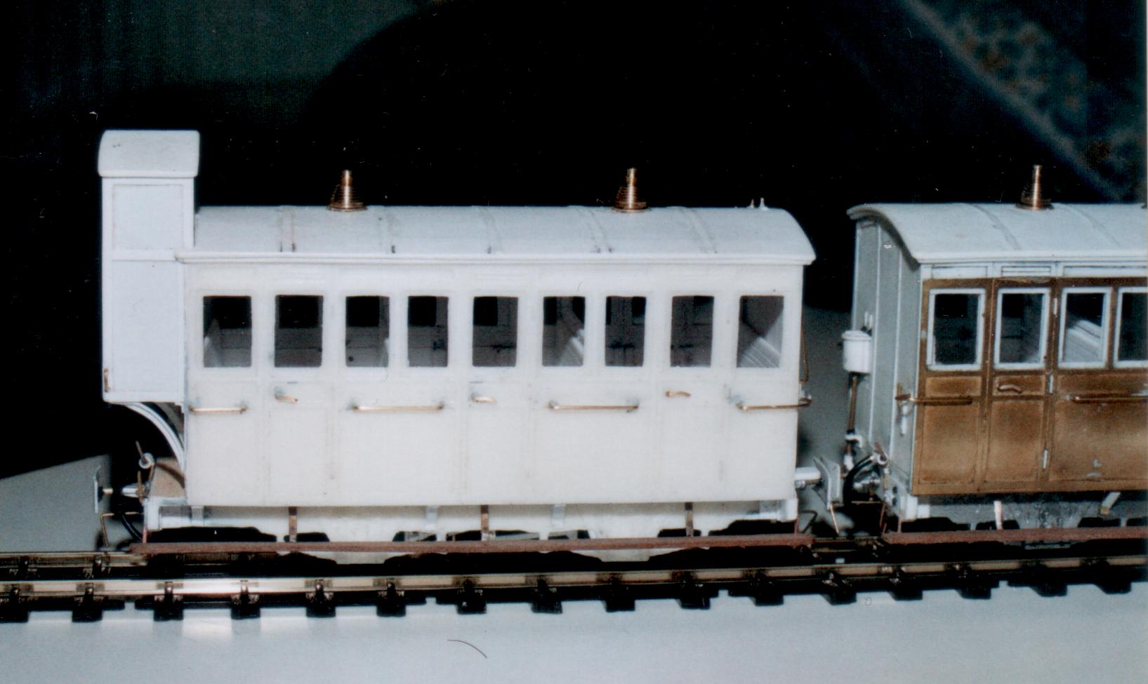 Ces deux charmantes voitures ne faisaient pas partie de mon programme, mais je reçu un jour en cadeau ce sympathique kit de chez Wrightline . Il se compose de deux longerons et de dossiers en métal blanc, deux flancs de caisse en laiton photo-gravées, quatre tampons, deux essieux avec roues fine-scale plus des feuilles de plastique et quelques fils de laiton. Malheureusement, en montant la voiture « à blanc »,je me suis rendus compte que son gabarit jurait avec le reste de mon parc : pas assez haute et surtout trop étroite ! Par contre les dimensions des fenêtres et leurs hauteurs correspondaient bien avec celles de mes voitures. Je décidais donc de refaire des dossiers plus larges et de rehausser les faces latérales dont je galbais le bas pour accentuer la francisation. D'autres modifications ont été apportés, notamment l'échancrure des longerons du châssis pour les rendre un peu plus « léger ». D'habitude, je colle le châssis sur le plancher de mes wagons, mais dans le cas présent la rigidité des longerons empêche le démontage des roues. Pour remédier à cela, je n'ai collé qu'un seul longeron, l'autre est vissé à travers le plancher et peut être ainsi démonté à la demande . je poursuivait la construction de la voiture lorsque l'idée me vint d'en réaliser une seconde. Au regard des modifications apporté au kit d'origine, je ne voyais pas l'intérêt d'en acheter un second et d'être obligé de tous recommencer ! Aussi j'optais pour un moulage en résine polyuréthane d'un longerons et d'un flanc de caisse. La réalisation du moule de ce dernier fut acrobatique, la caisse étant déjà assemblé, de plus c'est une pièce galbé ! Néanmoins le résultat combla mes espérances et, peu de temps après, je me retrouvais en possession d'une deuxième voiture. Je rêvais depuis longtemps d'une voiture avec guérite serre-frein, comme on en voyait sur certains réseaux à voie métrique. Je sautais donc sur l'occasion et traçais rapidement un plan pour vérifié la faisabilité. La guérite est faite en carte plastique de 0,5 mm et repose sur une plate-forme en bois posé sur des jambes de forces également en plastique ,mais si cela était à refaire,je réaliserais l'ensemble en laiton pour plus de rigidité. Ces voitures sont représentées dans leurs état de 1920, c'est à dire qu'elles ont, outre le frein à main, le frein Westinghouse avec toute « l'usine à gaz » que cela sous entend...Le dessous des châssis est donc bien chargé. Les toitures sont démontables et réalisées avec une double feuille de plastique mise en forme à l'eau chaude et contrecollées sur une armature qui s'emboîte sur la caisse. Ils reçoivent des fines bandes de 1 x 02mm représentant les joins de la toile goudronnée et les cabochons d'éclairage en laiton (culasses de canons pour navires anciens).Les marchepieds longitudinaux sont en bois de noyer collés sur des supports faits avec des agrafes mise en formes . Les petits accessoires sont préparés : poignées de portes en fils de laiton mise en forme, chaînes de sécurités, demie-accouplements de frein. Ils seront collés après la peinture. Puis une patine légère vient parachever le travail et les voitures peuvent prendre leurs service !
