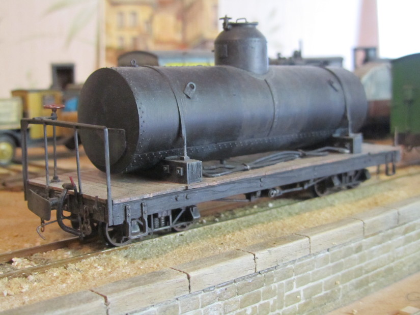 Sur le châssis du wagon citerne, j'ai refais les longerons extérieurs (la partie liée au plancher) car je voulais supprimer les supports de ranchers( ces 2 longerons sont mis précieusement de cotés car ils vont resservir!). Un garde-corps avec un volant à été rapporté à une des extrémités. Le dessous du châssis à reçu un équipement de frein Westinghouse complet, plus la timonerie du frein à main. Les bogies ont été équipés de sabots de frein. La citerne à été débarrassé de ses mains-courantes et à reçu de nombreux éléments de détaillages comme le montre les photos.