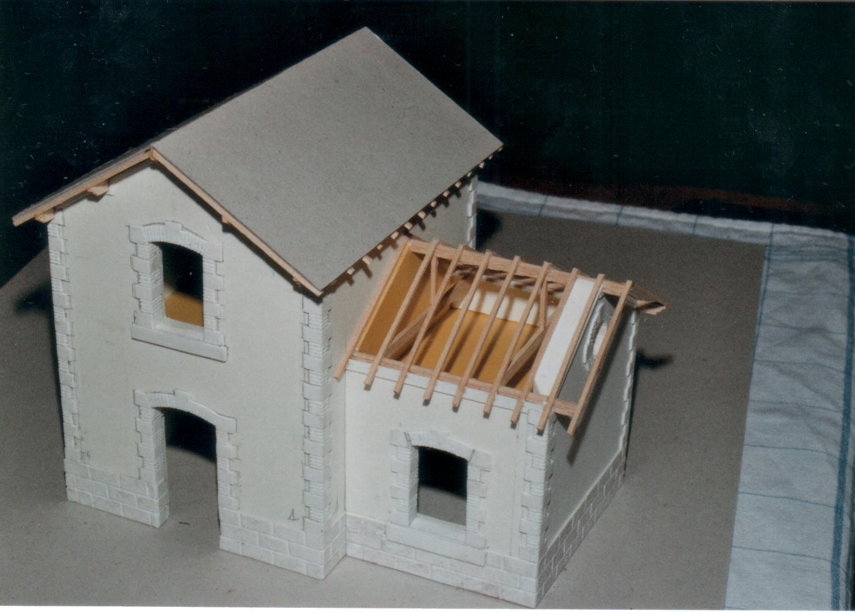 La construction est très simple : les murs principaux sont en PVC expansé (Forex) de 10mm d'épaisseur découpés à la scie circulaire à panneau (à cette époque je pouvais faire ce genre de chose sur mon lieu de travail : un atelier de menuiserie). Les angles sont assemblés par des coupes à 45° et les planchers (PVC de 3mm) s'encastrent dans les murs à l'aide de rainures. L'ensemble une fois collé (colle spéciale PVC) est indestructible ! Les soubassements et les parements alternés sont découpés et gravés avec un gabarit dans des plaques Evergreen- travail long et très fastidieux-mais à l'époque je n'avais pas la possibilité de me procurer des plaques estampés « brique ». Au niveau des ouvertures, l'habillage vient à mi-épaisseur, créant ainsi une feuillure pour recevoir les futurs huisseries. Les linteaux ainsi que l'encadrement de l'œil de bœuf sont découpés et gravés à la demande en une seul pièce. Ils sont collés sur le PVC à la colle liquide (curieusement la colle PVC ne colle pas le polystyrène sur le PVC, Mais la colle pour polystyrène colle très bien le PVC sur le polystyrène ! Par contre elle ne colle pas les pièces en PVC entre elles ! Vous m'avez suivi, ou il faut que je recommence?). Les huisseries du bas sont découpées dans du carton, elles sont faites en double (intérieures/extérieures) et collées après peintures de par et d'autres d'une plaque de rhodoïd. Les menuiseries du haut sont réalisées de la même manière, mise à part qu'elles sont en plastiques de 5/10eme. Les toitures sont constitués d'une âme en carton de 2 mm sous lesquelles sont collées les pannes en bois de 5x2mm. Ils sont entaillés vers le bas pour recevoir les morceaux de chevrons. L'ensemble est recouvert d'ardoises en papier CANSON gris anthracite. Les bandeaux en bois de 7x8/10eme sont collés ensuite et reçoivent sur leur faces internes des solins en papiers autocollants.