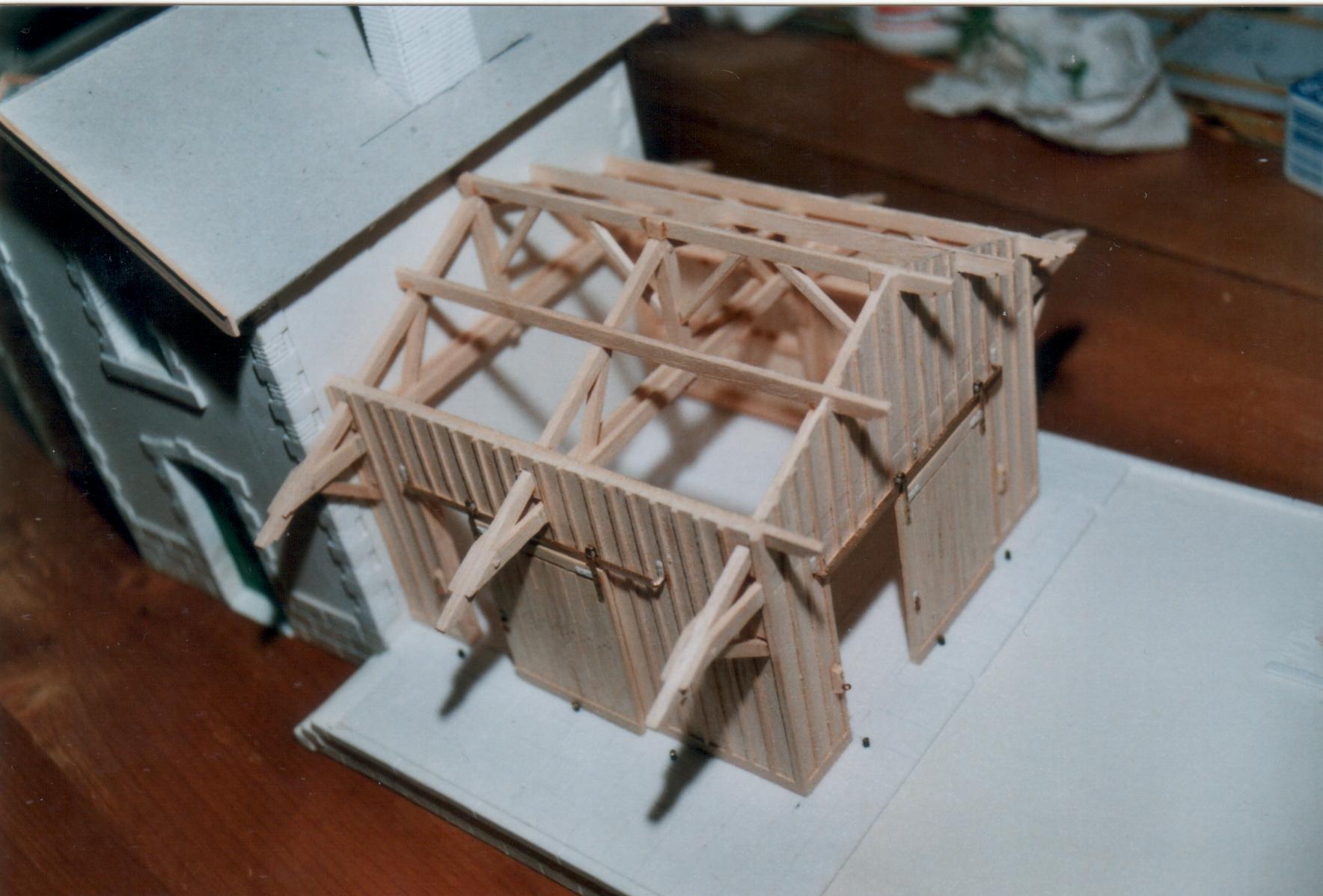 Le quai de la halle est réalisé avec les mêmes matériaux que la gare : âme en 3 plaques de PVC de 10mm superposées habillées avec des pierres gravées en plastique. La halle est entièrement en bois : Les trois fermes sont d'abords assemblées sur un gabarit, puis l'on taille un tenon dans le bas de chaque poteaux. Ces tenons viennent s'emboîter dans des mortaises pratiquées dans le socle. Le reste de la charpente est ensuite assemblée puis le bardage constitué de planchette de samba de 7/10eme d''épaisseur est posé, puis tous les couvres joints en 2 x 0,7mm. Les portes (samba de 1mm) sont fabriquées, leurs ferrures en laiton ont un galet tiré d'un tube d'aluminium de 2mm de diamètre, celui ci vient s'appuyer sur un rail en laiton 1,5 x 0,8 mm fixé au dessus des ouvertures. Les pannes sont ensuite posées puis les chevrons et enfin les voliges figurées par deux plaques de samba de 0,8mm, gravées sur leurs faces internes, et collées sur chaque pan de toitures. Celle-ci reçois les mêmes ardoises que la gare. Les murs de la halle reçoivent un badigeon de noir mélangé de brun et de rouge.Un lavis marron clair est simplement passé à l'intérieur. Puis intérieur et extérieur reçoivent un dry brush de gris très clair. Les plaques nominatives ont été commandé dans un magasin de reprographie (plaques pour boite aux lettres). Elles représentent des plaques gravés en pierre (ou en plâtre?) telle que l'on en voyait sur certaines gares. Ceci pour changer des sempiternelles plaques émaillées bleu et blanche que l'on voit sur toute les représentations de gares. La plaque qui orne le fronton de la halle (qui est émaillée dans la réalité) est faite à l'aide d'une photocopie d'une des plaques de la gare sur du papier autocollant collé (forcément!) sur une plaque de plastique de 0,5mm taillée à la bonne dimension et passée au vernis satiné. L 'ensemble gare-halles est patiné avec des feutres d'écolier estompé avec un coton tige imbibé d'essence à briquet (voir chapitre « mes réalisation »). L'horloge est un cadran découpé dans une boite d'After Eight (pub gratuite)- la gourmandise a des avantages,même si elle est un vilain défaut !- son encadrement est un morceau de rivet pour bâche dans lequel à été inséré un morceau de rhodoïd, le tout est collé sur une rondelle en plastique. Les deux réverbères en appliques sont de la marque allemande Viessmann . Pour facilité le démontage, l'ensemble BV-halle à été posé sur un socle en plastique de 4mm d'épaisseur, gravé et décoré de façon à imiter un trottoir. Celui ci s'emboîte enter des petite lattes de samba poncées et collés sur la plate-forme du réseau de manière à figurer un caniveau. Les intérieurs ne sont pas décorés pour l'instant, seul des rideaux en papier à cigarette ornent quelques fenêtres. La halle recevra bientôt un éclairage.